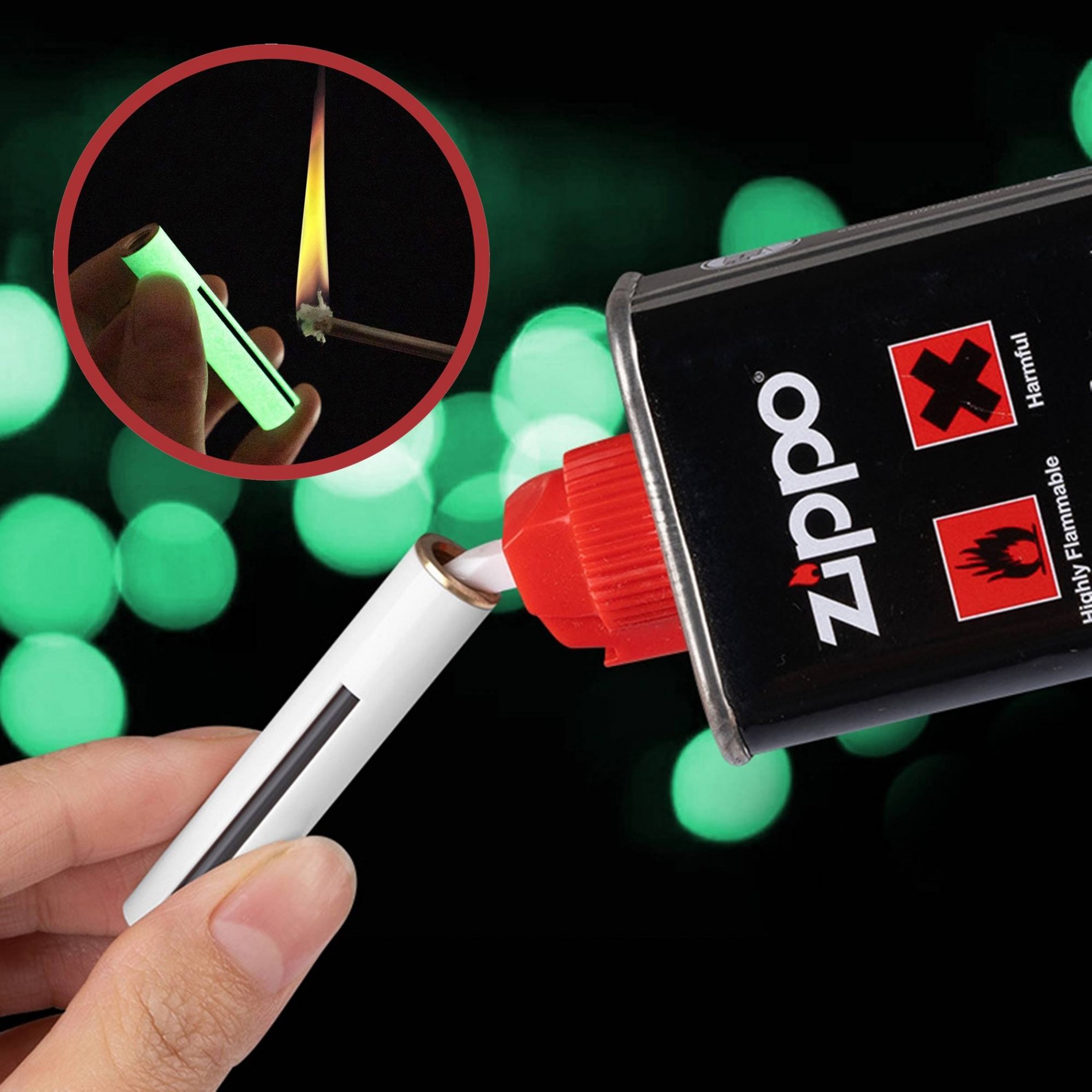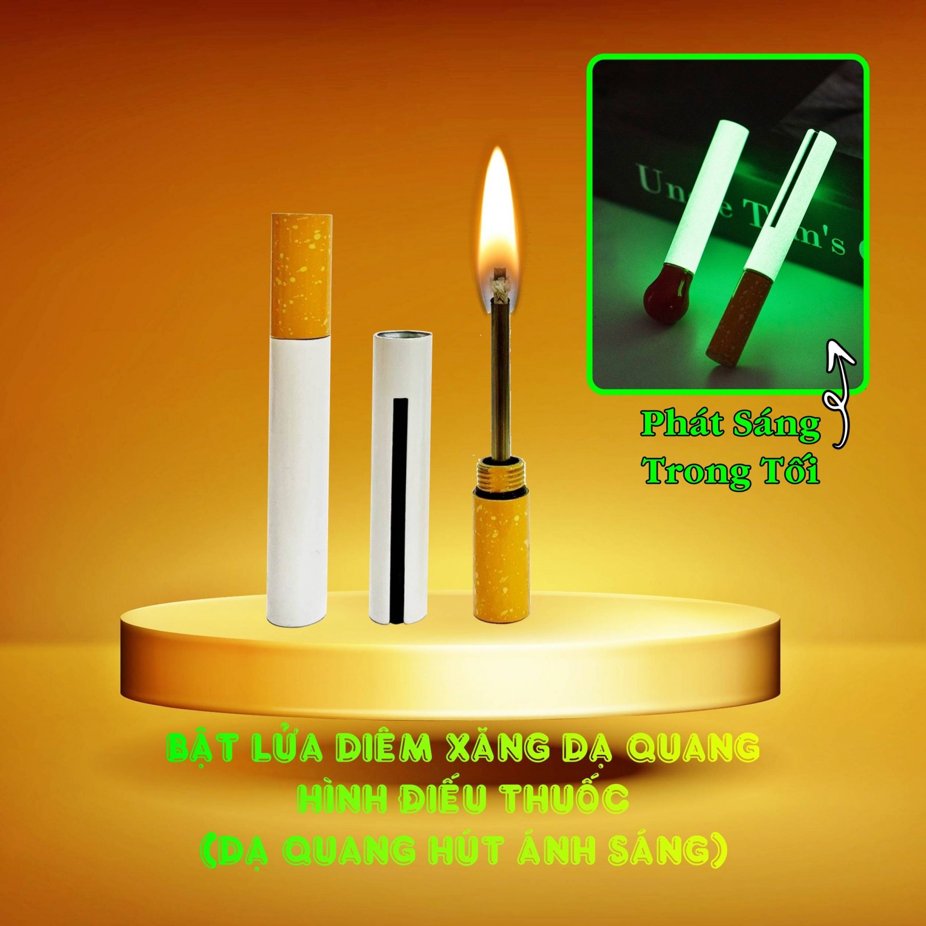 Hãy thỏa mãn niềm đam mê với ngọn lửa và phong cách độc đáo với bật lửa diêm xăng dạ quang hình điếu thuốc. Sản phẩm thiết kế tinh tế, sang trọng, kết hợp hài hòa giữa ánh sáng dạ quang lấp lánh và hình dáng điếu thuốc thu hút mọi ánh nhìn.