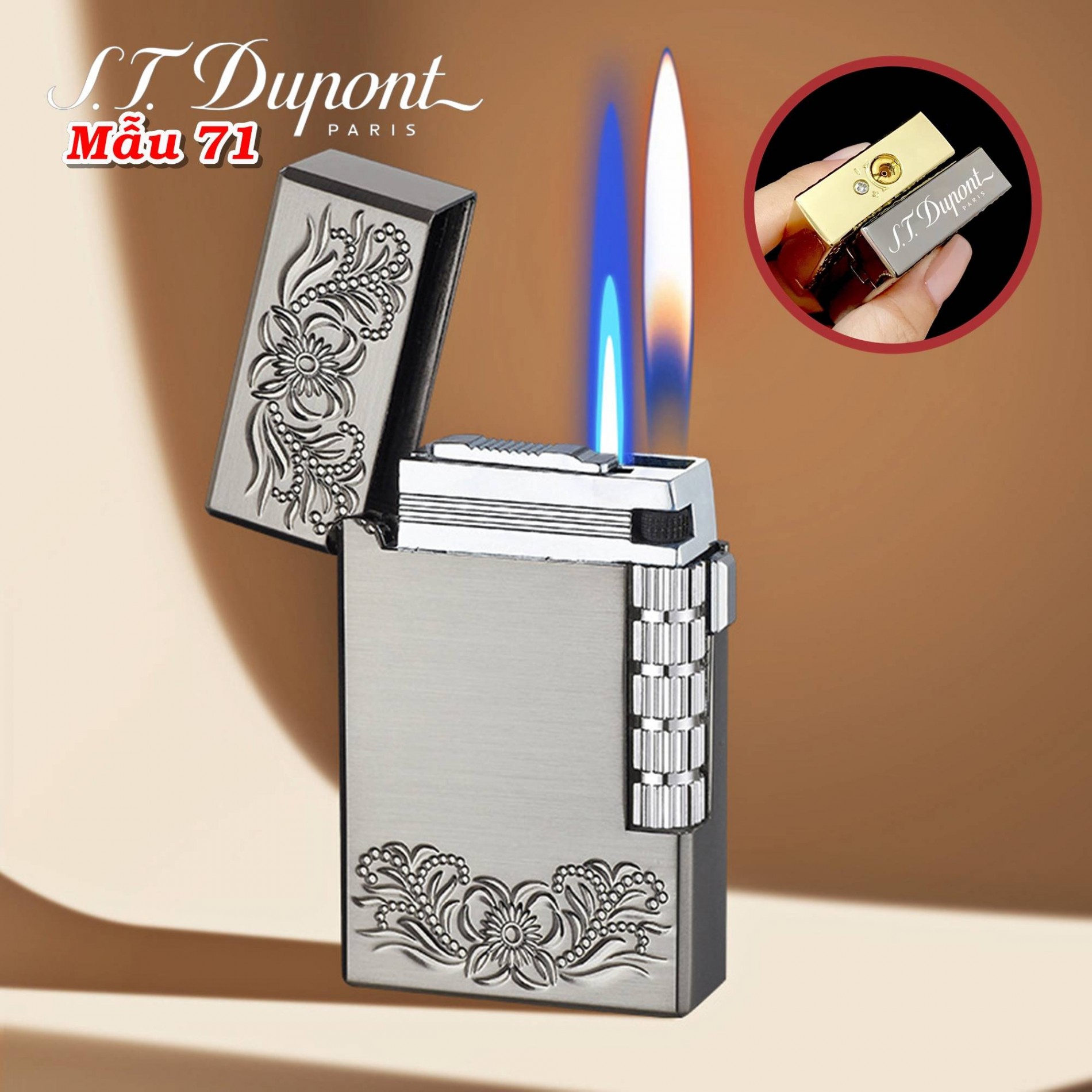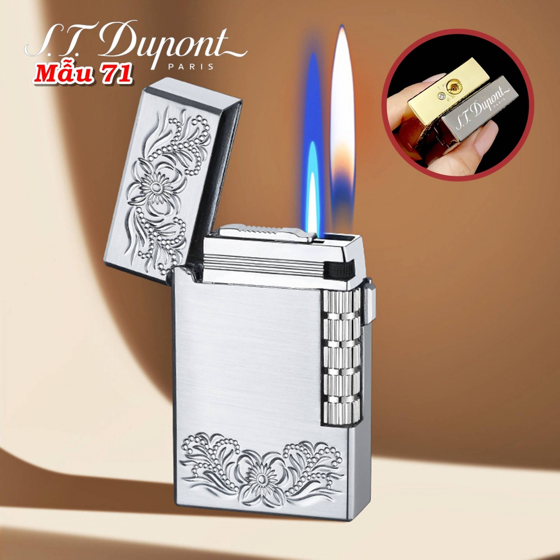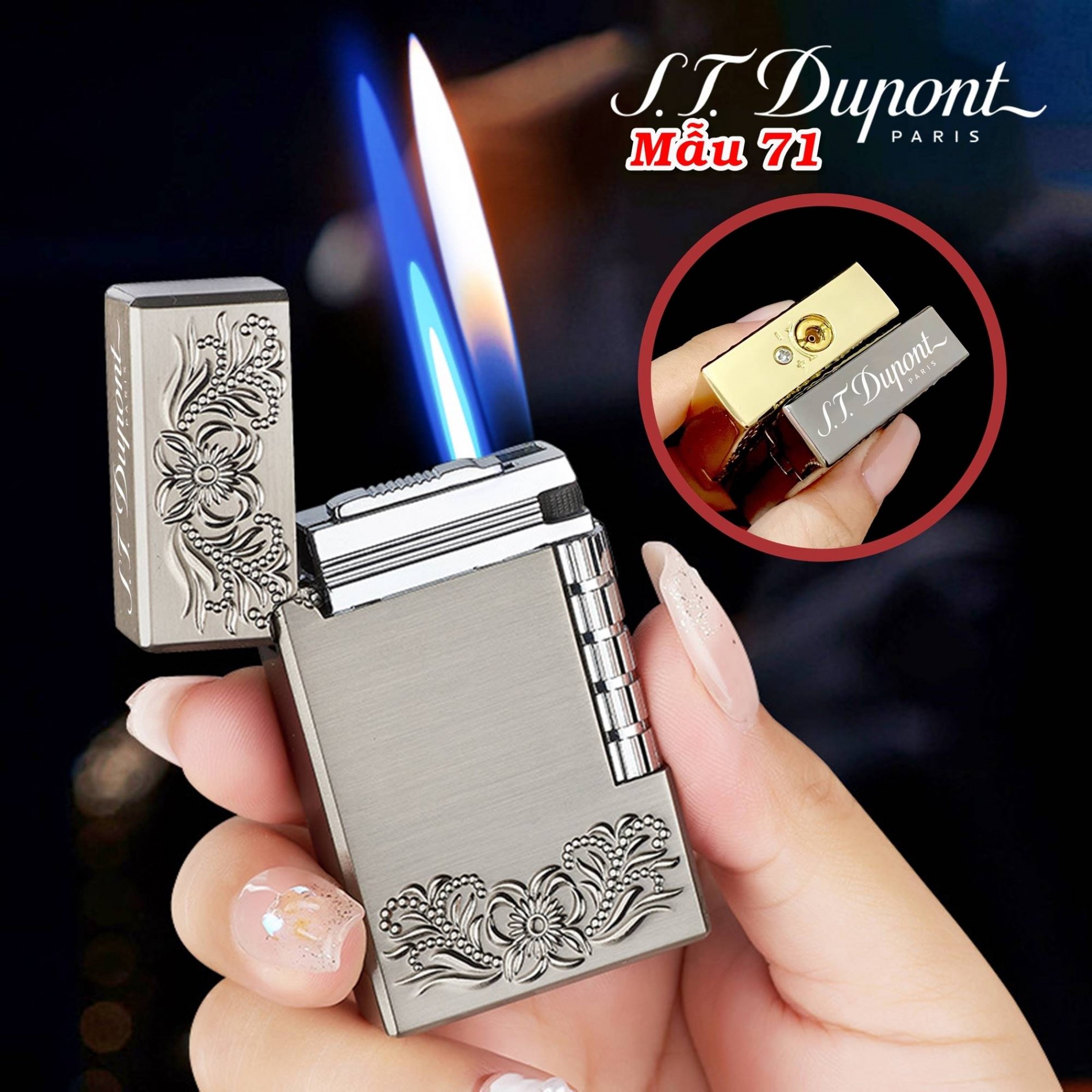 Bật lửa Dupont 2 chế độ lửa hình hoa văn M71 dùng gas